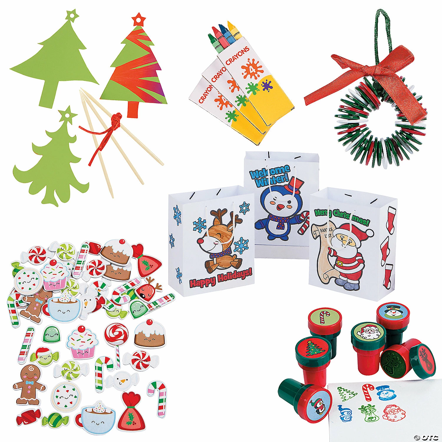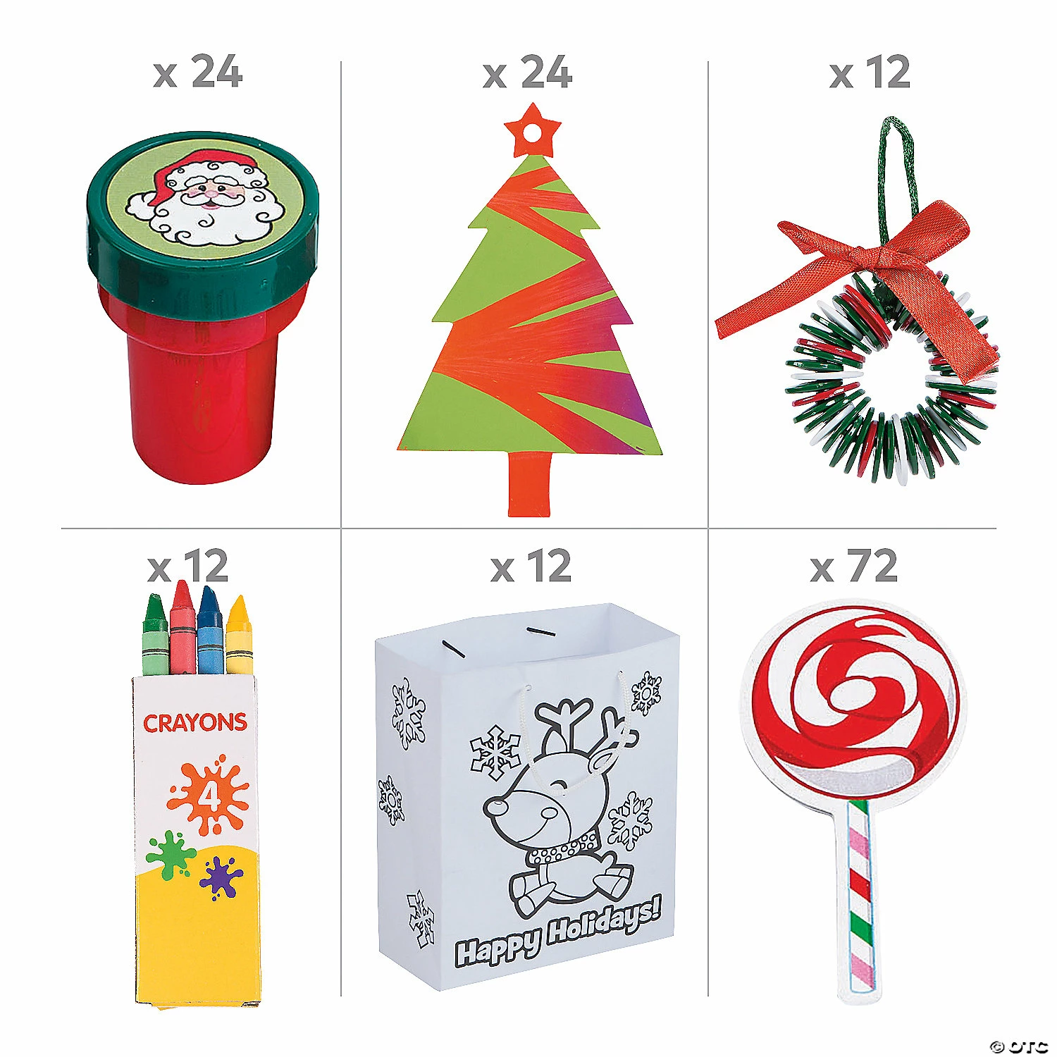 Holiday fun is in the bag with this fun activity kit! Featuring a variety of Christmas-themed crafts and activities, this kit also has color-your-own bags for kids to color. Distribute the fun crafts in the bags to students, young party guests or at a holiday family get-together for plenty of holiday-themed fun! Kids will be occupied and happy with this impressive kit! (156 pcs. per unit) Assortment may vary.Includes:โข 12 Plastic Button Wreath Christmas Ornament Craft Kits (2 1/4″)โข 72 Foam Christmas Candy Self-Adhesive Shapes (1/2″ – 2 1/4″)โข 12 Paper Color Your Own Medium Christmas Gift Bags (7 1/2″ x 3 1/2″ x 8 3/4″ with 4″ handles)โข 24 Plastic Holiday Stampers (1 1/2″ Safe and non-toxic. Conforms to ASTM D-4236.)โข 24 Paper Magic Color Scratch Green Christmas Tree Ornaments (Includes 24 paper ornaments, 12 plastic scratching tools and 24 satin ribbons. 5″)โข 12 4-Color Crayons (Safe and non-toxic. 4 assorted crayons per box. 3 1/2″ Conforms to ASTM D-4236.)