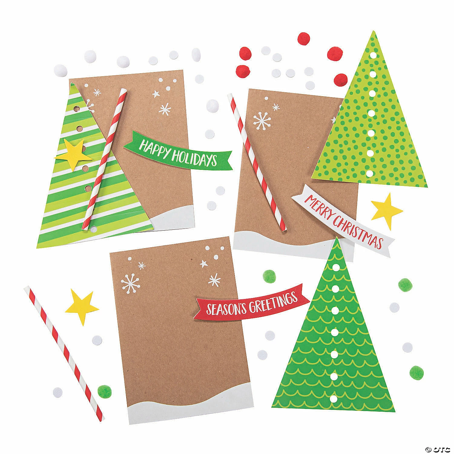 Help your little ones create cards they’ll be happy to hand out and make someone’s holiday merry and bright! Featuring bright green trees decorated in their December best, these cards are a must-have for kids’ Christmas crafts. They could even keep their finished DIY holiday card for themselves and display as décor during this special time of year! Includes paper straws and pom-poms. Cardstock. 5″ x 7″ Makes 12. All craft kit pieces are pre-packaged for individual use. Kits include instructions. © OTCChristmas Tree Card Kit Instructions