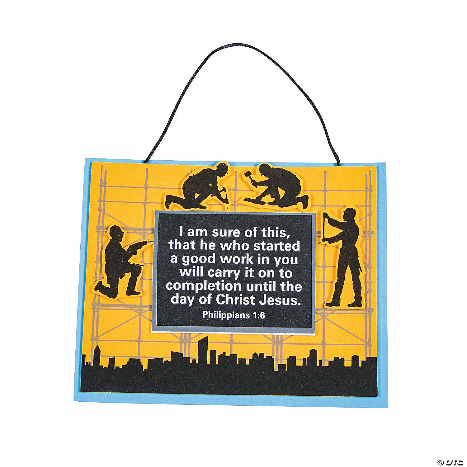 If youโre getting ready for a Construction Vacation Bible School theme, make sure you start with this sign! Great for religious crafts, this sign features a construction crew building over a skyline with text from Philippians 1:6. Best of all, it makes for a fantastic keepsake students can admire long after VBS is over. Includes self-adhesive foam pieces and satin cording. 7 1/2″ x 6″ Makes 12. All craft kit pieces are pre-packaged for individual use. Kits include instructions. ยฉ OTCConstruction VBS Verse Sign Craft Kit Instructions