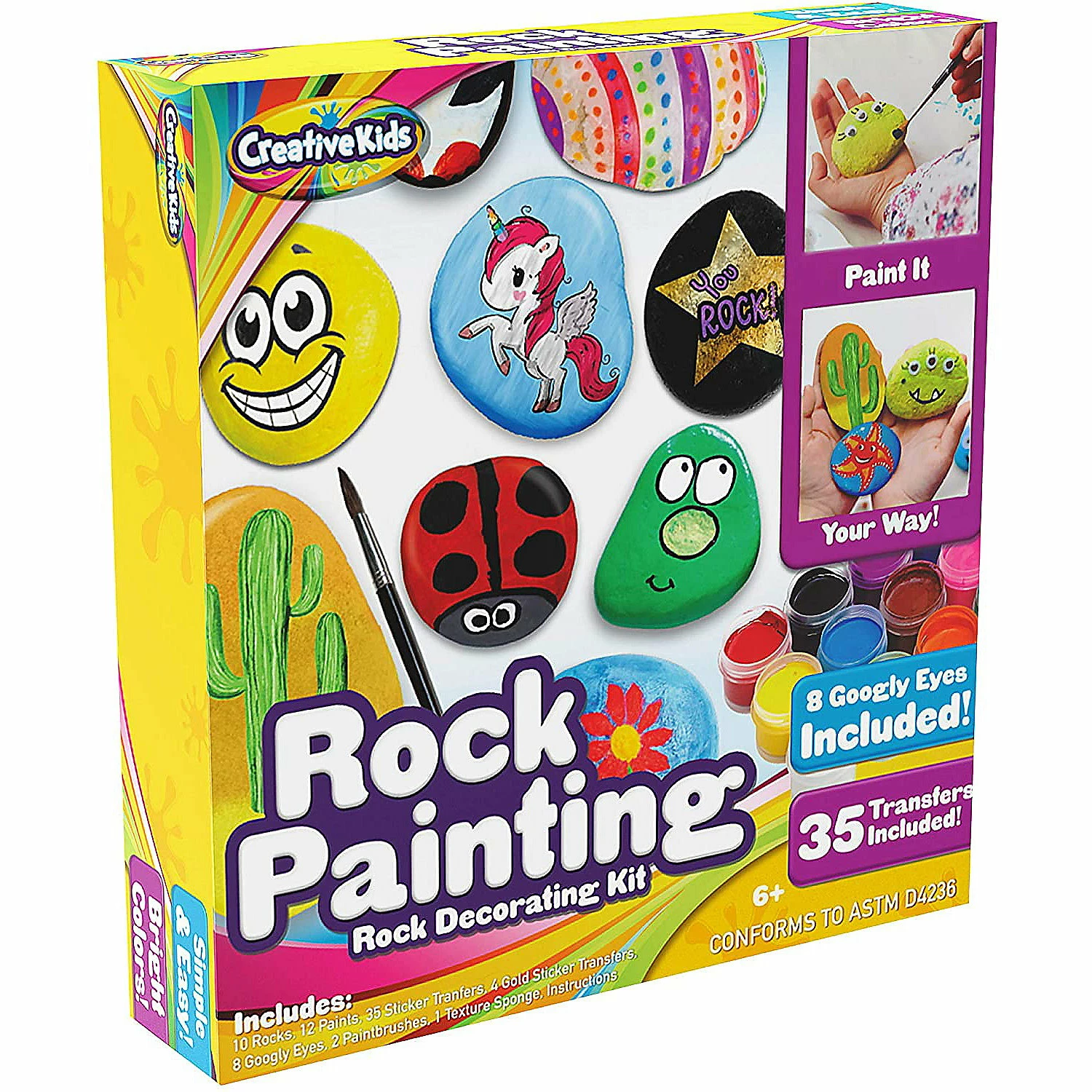 All Accessories Included β Extensive Set Includes [10] White, Glossy River Stones, [2] Brushes, [12] Vibrant Color Paints, [2] Transfer Sheets & [8] Googly Eyes