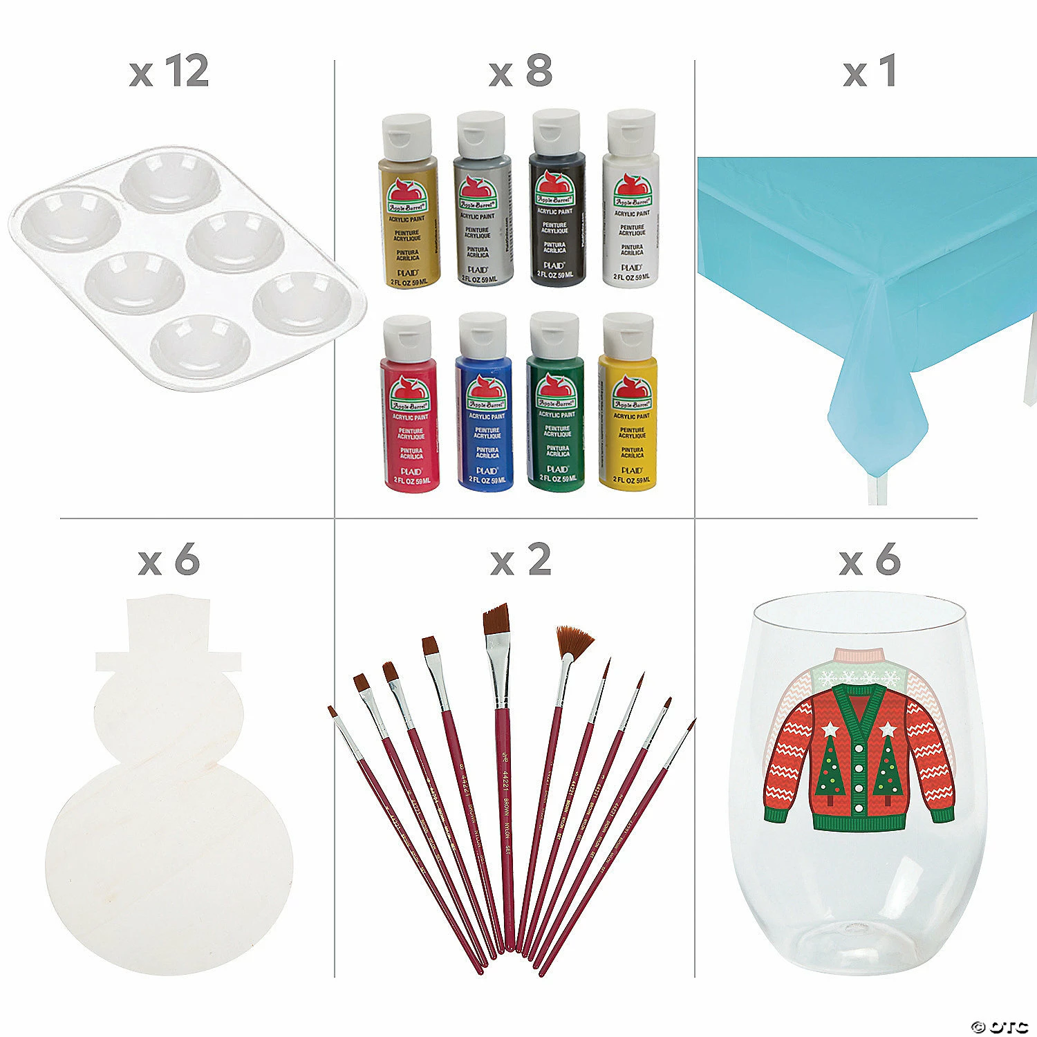This cute DIY craft is perfect for a cold, snowy day. Simply add your favorite wine (or eggnog for the kids) to help wash the winter blues away! This kit has everything you need and is great for holiday parties and adult craft night with family or friends. Having a little too much fun and spilled the wine? No worries, thereโs a disposable tablecloth included, too! Once finished, add this piece to your home dรฉcor or give it as a Christmas gift to someone special. (53 pcs. per unit) Assortment may vary.Includes: โข 8-Pc. Acrylic Primary Color Paint Set (Includes 8 primary colors each in a 2 oz. plastic bottle. Safe and non-toxic. Conforms to ASTM D-4236.)โข 6 Plastic Ugly Sweater Stemless Wine Glasses (4 1/2″ 12 oz.)โข 6 DIY Unfinished Wood Snowman Signs (15 1/4″)โข 1 Plastic Light Blue Tablecloth (Thin, slightly transparent. Disposable. 54″ x 108″)โข 12 Plastic Rectangular Paint Palettes (Holds up to 6 colors in 1/2″ deep wells. 5 1/4″ x 3 3/4″)โข 20 Plaidยฎ Brown Nylon Paintbrushes (Includes 6 round brushes, 6 shader brushes, 2 angular shader brushes, 4 filbert brushes and 2 fan brushes. 6 7/8″ – 7 7/8″)
