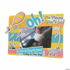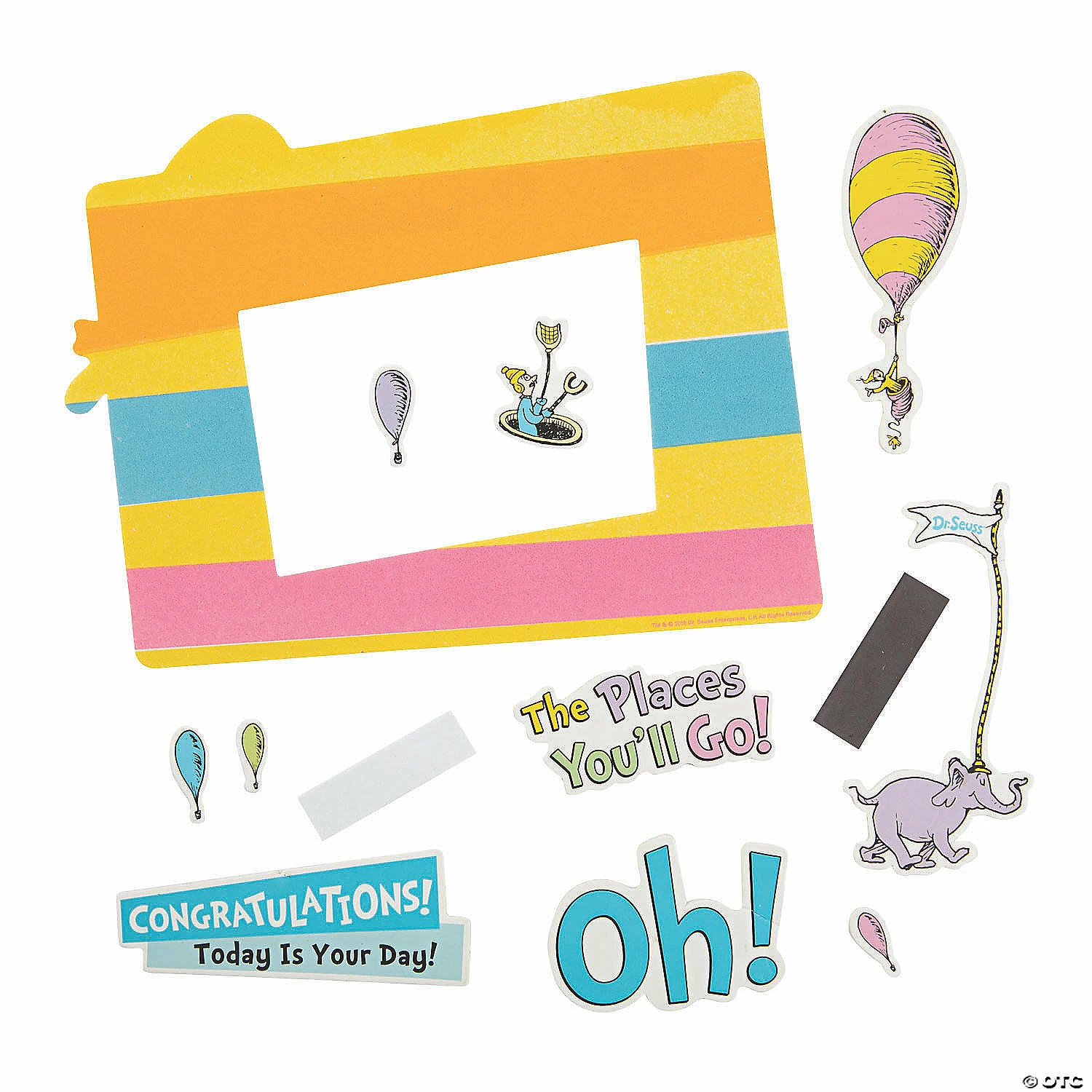 Graduating from any grade is a big deal. Celebrate the accomplishment with this fun and easy magnet frame craft kit. Featuring characters and imagery from the beloved Dr. Seuss™ book, this makes for a great project for the last day of school. Snap a photo of each student and place it on the completed craft for a frame kids will be proud of and parents will cherish. Includes self-adhesive foam pieces. 7″ x 5 1/2″ with a 3 1/2″ x 2 1/2″ photo space. Makes 12. All craft pieces are pre-packaged for individual use. Kits include instructions. © OTC / ™ & © Dr. Seuss Enterprises, L.P. All Rights Reserved.Dr Seuss Oh The Places Frame Instructions
