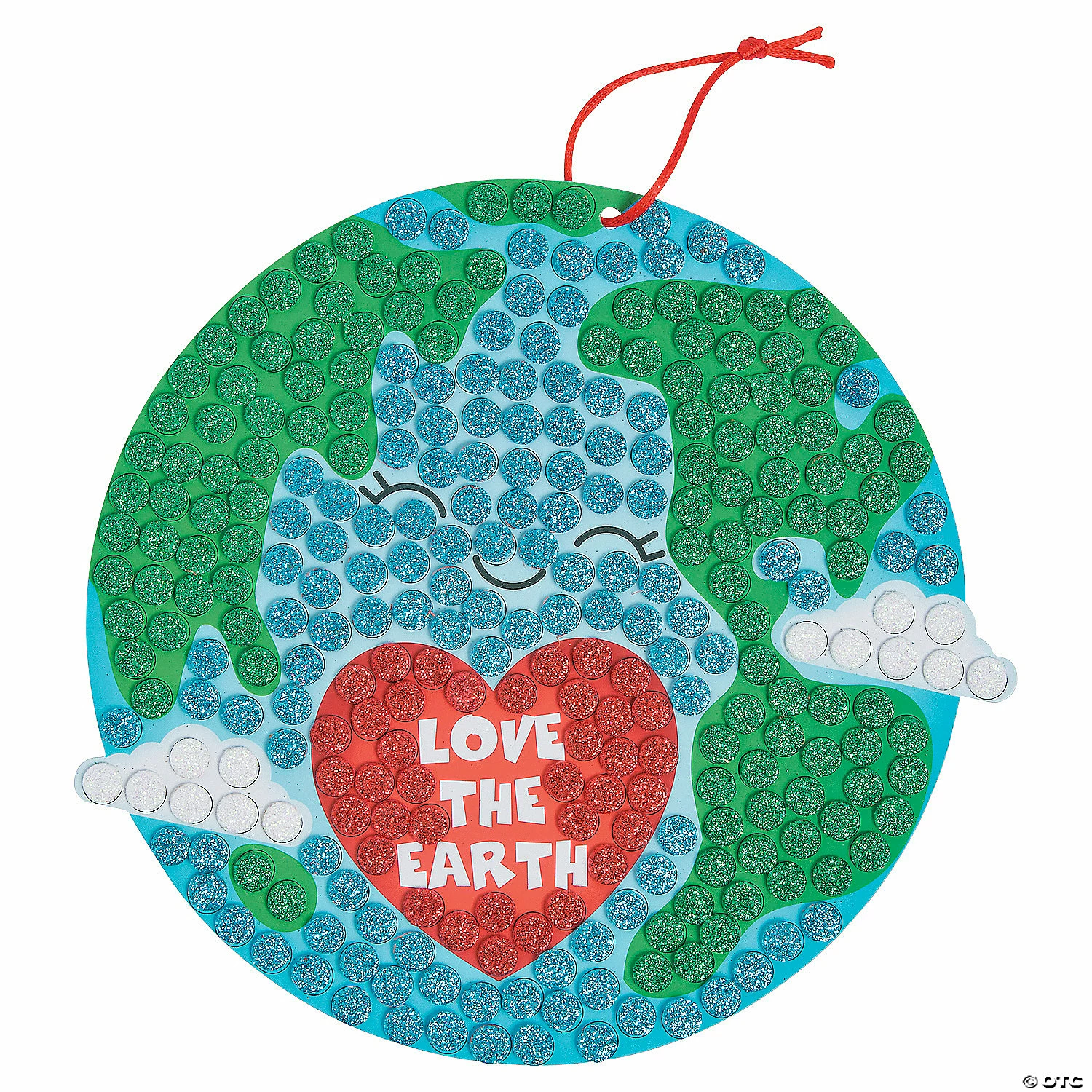 Have fun raising environmental awareness! A must-have for kidsโ craft supplies, this Earth Day project teaches little ones that everyone can do their part to protect the planet. Each Earth-shaped sign shimmers and shines with glitter when finished and comes printed with a big heart that reads โLove the Earthโ. Add it to your classroom supplies and combine arts and crafts time with a lesson about how our planet is our most precious possession. Includes self-adhesive foam pieces and satin cord. 9″ x 8 1/2″ Makes 12. All craft kit pieces are pre-packaged for individual use. Kits include instructions. ยฉ OTC Earth Day Sign Glitter Mosaic Craft Kit Template/a