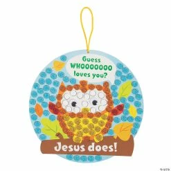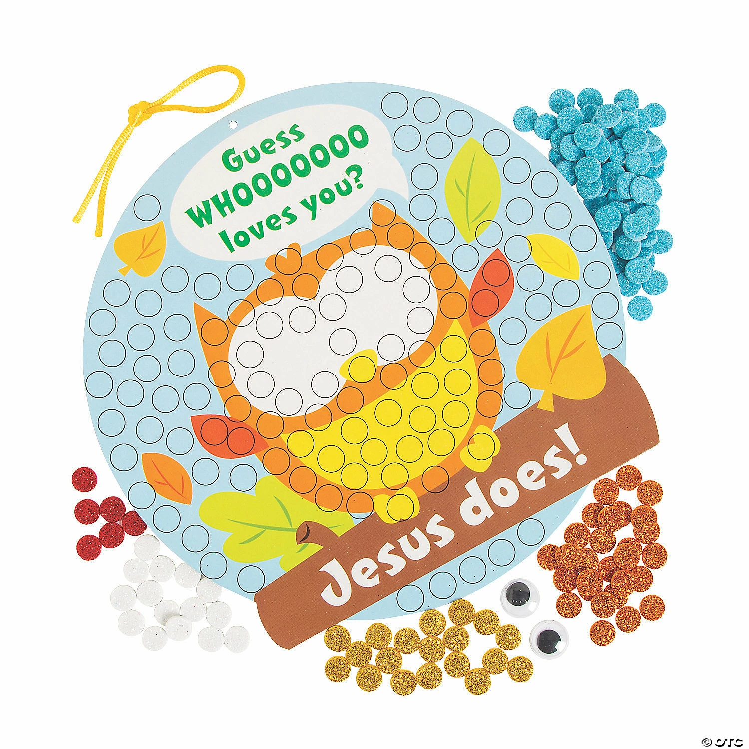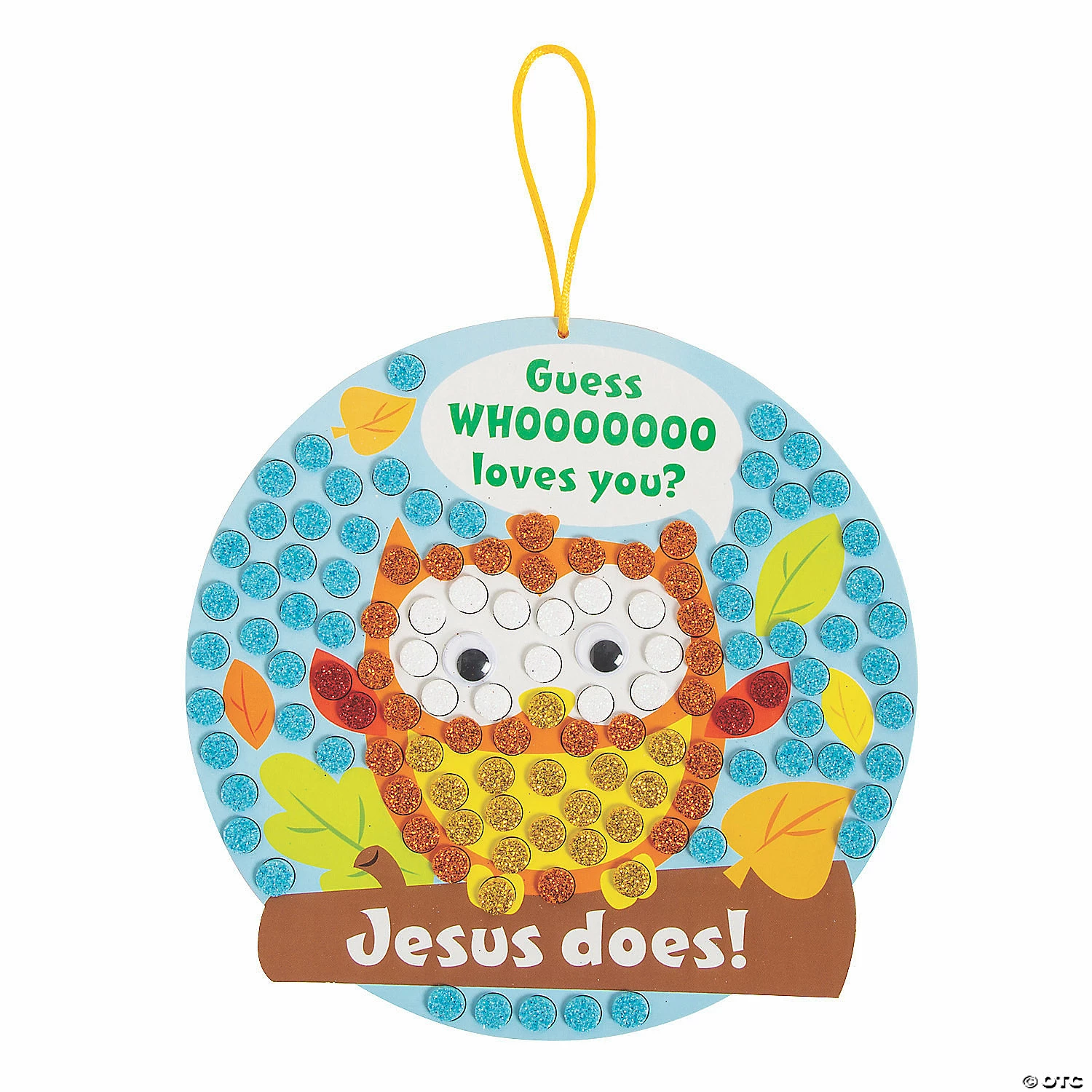 Use your creativity to celebrate Jesusโ love and the fall! Perfect for kidsโ crafts, this sign features a design of a glittering owl sitting among autumn-hued leaves. Kids can easily make this then display at home as bedroom dรฉcor from the beginning of September through Thanksgiving. Includes self-adhesive foam pieces, googly eyes and satin cording. 8″ Makes 12. All craft kit pieces are pre-packaged for individual use. Kits include instructions. ยฉ OTCGuess Who Loves You Mosaic Owl Craft Kit Instructions