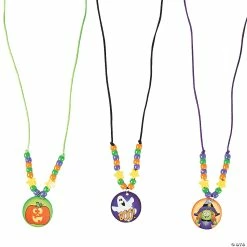 Create your own Halloween costume accessories with this Halloween Beaded Necklace Craft Kit. Perfect for classrooms and day cares, or as a fun craft to hand out during your Halloween party. Includes a 30″ satin breakaway cord, 1/4″ plastic pony beads and 1 1/2″ paper pendants. All craft kit pieces are pre-packaged for individual use. Kits include instructions and extra pieces. Makes 50. © OTC