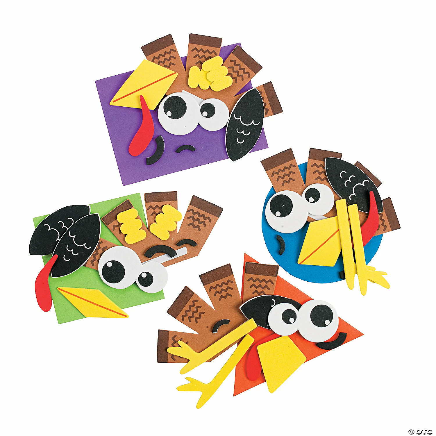 Use a variety of common shapes to make unique little gobblers! Foam with self-adhesive pieces. 4 1/2″ – 5″ x 4 3/4″ – 6″` Makes 12. ยฉ OTC Shape Turkey Craft Kit Template/a